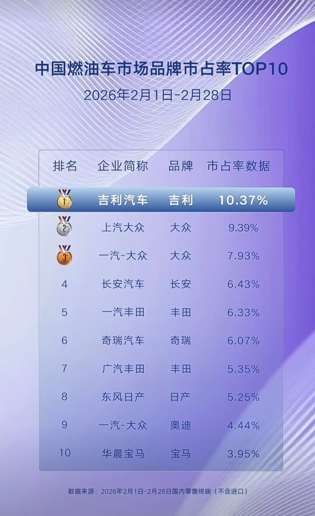 根据一份最新的终端统计数据显示,2026年2月,吉利以10.37%的燃油车市场占有率,超越了上汽大众、一汽-大众、一汽丰田等合资品牌。而在去年,吉利全年的燃油车市占率为8.01%,尚排在上汽大众之后。