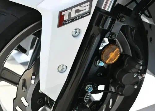 提供反射式LED大灯、无钥匙启动、全新USB充电接口、VA液晶仪表、三段可调后双侧弹簧减震器、双通道ABS、TCS等,融入支持智能互联的前置摄像头行车记录仪。